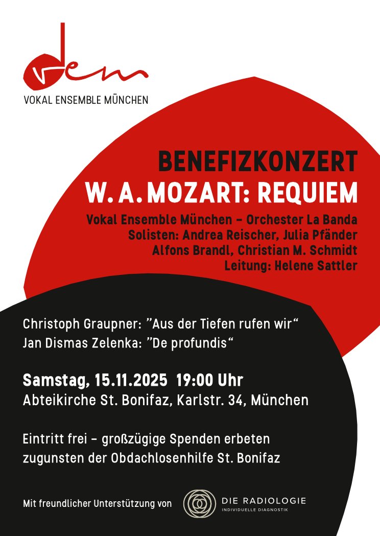 Am Samstag, den 15. November 2025 um 19 Uhr, lädt das Vokal Ensemble München gemeinsam mit dem Orchester La Banda zu einem Benefizkonzert mit freiem Eintritt in die Abteikirche St. Bonifaz, Karlstr. 34, München ein. Unter der Leitung von Helene Sattler erklingen drei außergewöhnliche Werke, die das Thema der Bitte und Klage eindrucksvoll vertonen.