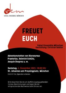 Bitte beachten Sie die am Aufführungstag geltenden Corona-Bestimmungen und legen Sie die entsprechenden Nachweise beim Einlass vor. Im Moment gehen wir davon aus, dass das Konzert unter Einhaltung der 2G-plus-Regel stattfinden wird. Dies bedeutet, dass Sie genesen oder geimpft sein müssen und einen gültigen Schnell- oder PCR-Test vorweisen können. Wir möchten Sie desweiteren bitten, während der gesamten Verweildauer in der Kirche Ihre FFP2-Maske aufzubehalten und – auch in den Pausen – möglichst wenig zu sprechen! Falls Sie erkältungsähnliche Symptome wie Husten oder Niesen oder Gliederschmerzen verspüren, bleiben Sie vorsichtshalber zu Hause! Vielen herzlichen Dank!